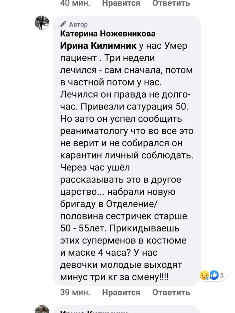 зачем и кому это надо знать,видеть,слышать и читать??почему до коронавируса так подробно не описывали,не пугали и не рассказывали как умирают люди в реанимациях от гриппа,от рака,от инсульта??смерть она никому не к лицу,никогда не была и не будет романтичной,лёгкой и весёлой.