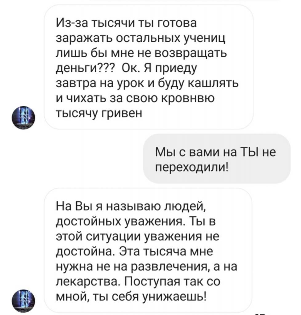kruksik Женщина! Преподаватель скинул скриншоты, но не все. Первый скриншот как ей говорят что не смогут прийти, а следующий как девушка уже реально злится что ей не хотят вернуть деньги. А что было в середине? Когда отказывались возвращать деньги, что отвечали на этот счёт? Как аргументировали? Нет мы не видим переписку.
