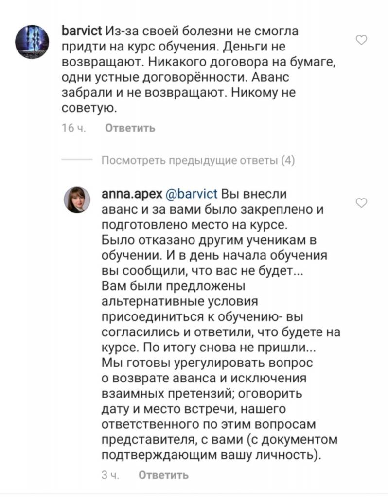 Была лично на курсе в Апекс у Анны Авдеевой и невольно стала свидетелем этого... Всем известно, что аванс не возвращается, и действительно бронируется место на курсе. И дама, которая выше написала про аферу, на протяжении всего курса писала всякую чушь, несмотря на то, что ей сказали, что вернут деньги- видимо потому, что с такими проще не иметь никаких дел...