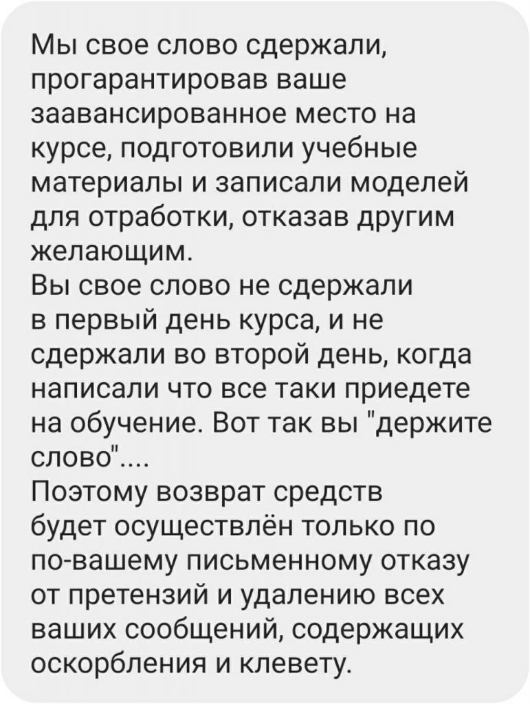 Хочу предупредить всех, кто собирается посетить ЛЮБЫЕ курсы. Подписывайте официальный договор, в котором прописывается обязательства преподавателя, предоставляемого обучение и обязанности ученика( оплата-предоплата курса, все спорные моменты).