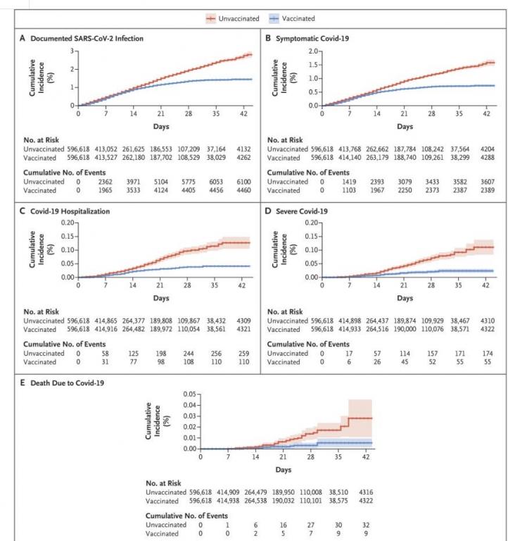 Здесь это по графикам хорошо видно, первые 14 дней синяя и красная линия растут +/- одинаково, а после 28 дня синяя (привиты) перестает расти вообще, то есть заражения, тем более тяжелые и смертельные случаи сходят на нет, в то время как не привитые продолжают заболевать и умирать.