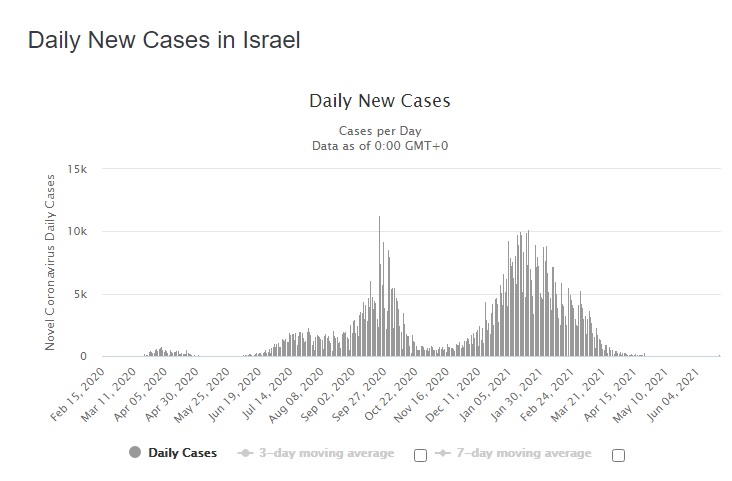 Вот так выглядит график дневной заболеваемости в стране где провакцинировано двумя дозами 55% населения и где "вспышкой" считается сотня заболевших.