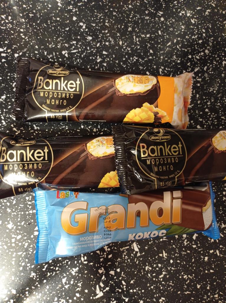 Мороженое Гранди покупаю давненько Банкет второй раз берём , не приторное с кусочками манго.