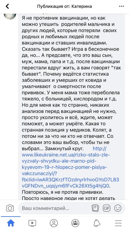 Да, я получил первую дозу (после очень тщательного взвешивания всех разновекторных факторов), некитайским средством (одно из моих главных условий), следующую порцию получить надо в пределах 7 октября. Но даже после этого на стану не только оголтелым ваксом, но просто ваксом (как это, может, хотелось кому), был и остаюсь адвокатом свободного без всяческого принуждения выбора и категорически против стигмы в любом виде тех людей, кто ещё не совершил выбора или сделал его не в пользу укола.