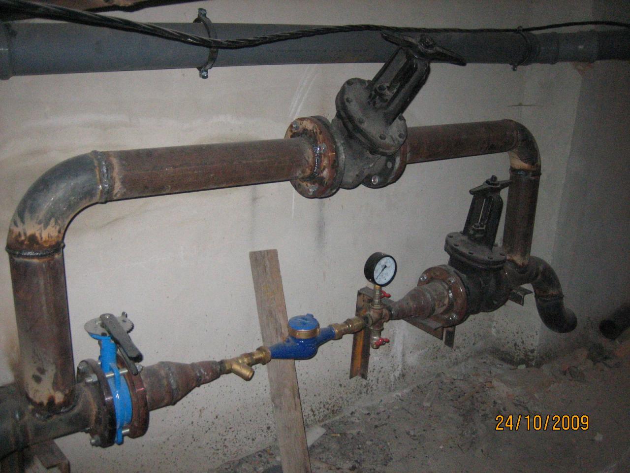 Перед вами на фото узел учета воды. 1. фото это ввод от внешней трубы в подвал. 2. фото это сам узел со счетчиком учета и манометром показывающим давление воды, как видим на манометре стрелка на нуле.