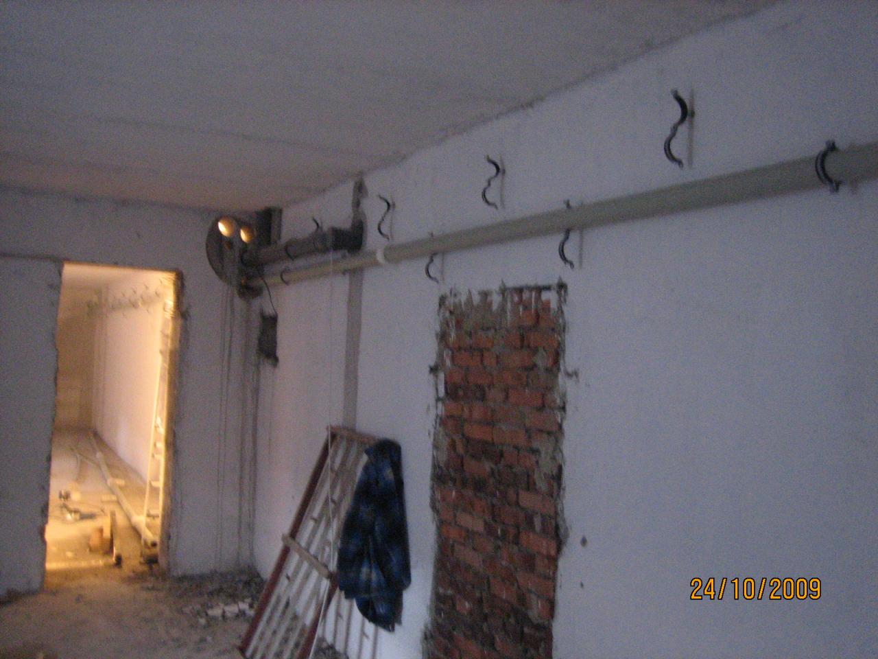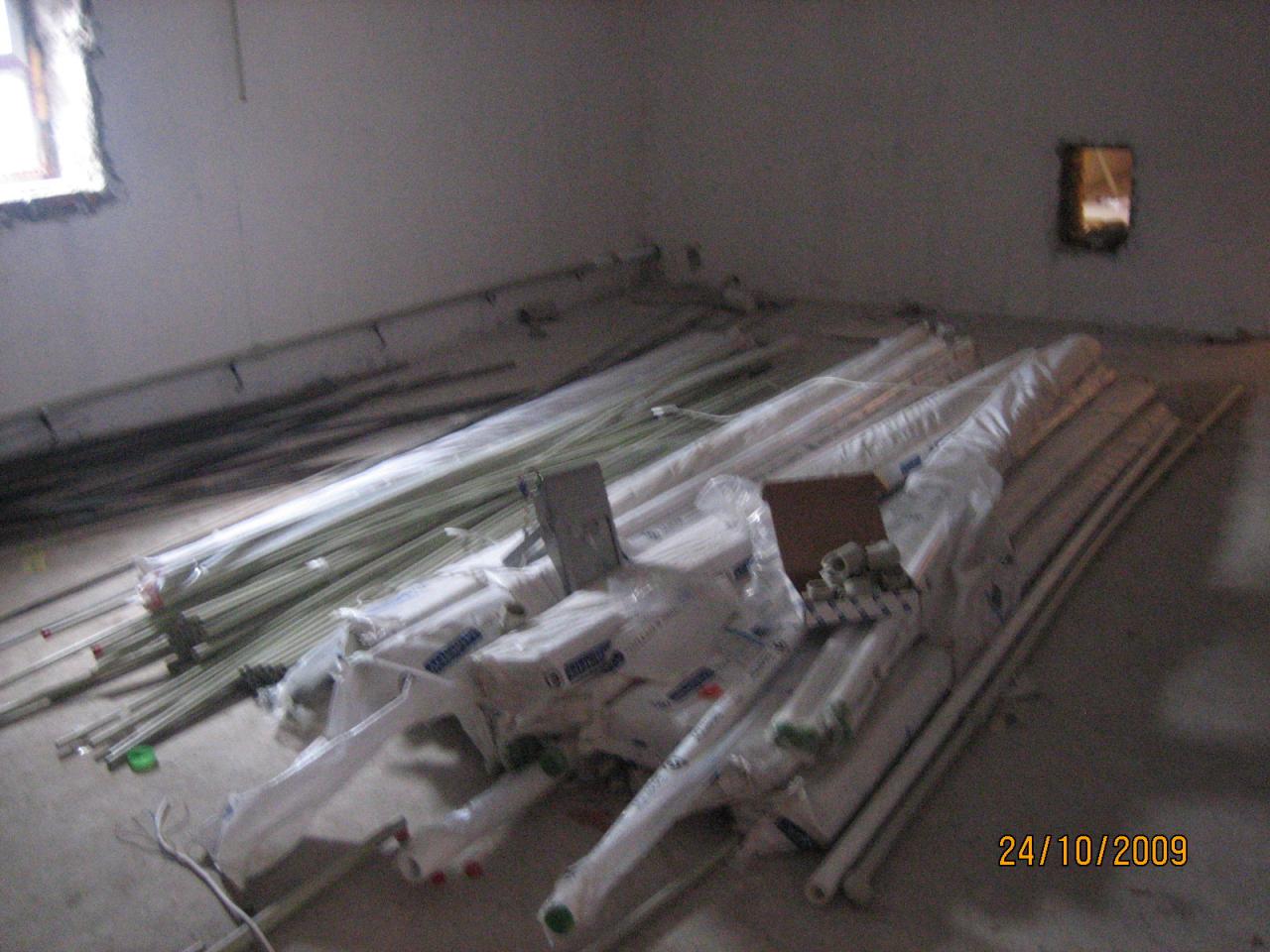 Следующие фото это материалы для водопровода которые должны быть сварены и укреплены на стенах, а не валятся на полу. То что укреплены на стенах это начало монтажа коммуникаций во 2 секции.