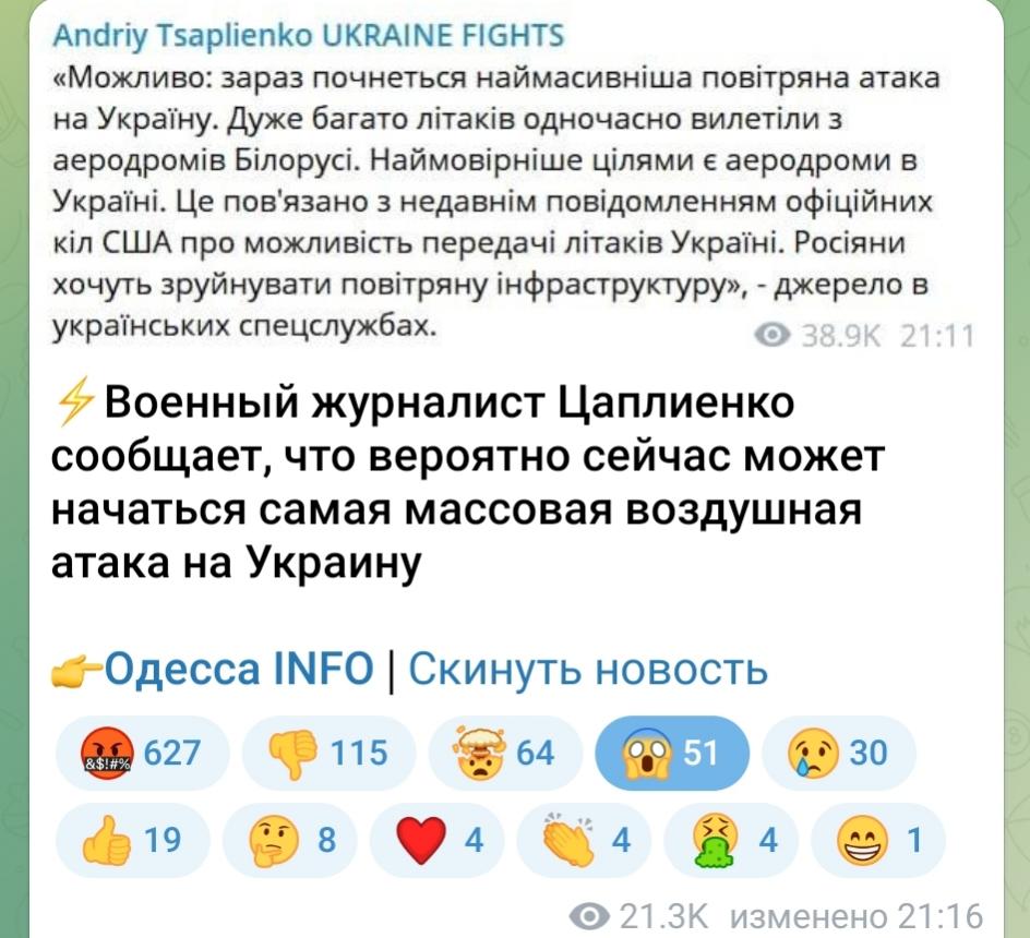⚡️Военный журналист Цаплиенко сообщает, что вероятно сейчас может начаться самая массовая воздушная атака на Украину