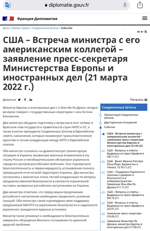 похоже на фейк, только вчера " Госсекретарь США Энтони Блинкен и министр иностранных дел Франции Жан-Ив Ле Дриан в понедельник, 21 марта, обсудили войну в Украине и ужесточение санкций против РФ. Об этом сообщила пресс-служба французского МИД.