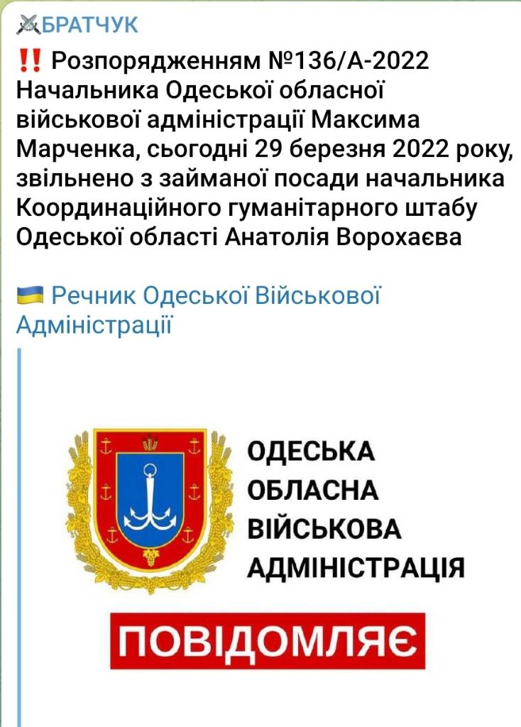 ​​‼️ Розпорядженням №136/А-2022 Начальника Одеської обласної військової адміністрації Максима Марченка, сьогодні 29 березня 2022 року, звільнено з займаної посади начальника Координаційного гуманітарного штабу Одеської області Анатолія Ворохаєва