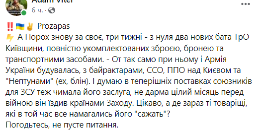 Нам рассказал человек из лагеря Порошенко. Этот черт уже думает о своем политическом будущем, регулярно общается с Грынивым. И все, что планирует делать - раскачивать общество на теме НАТО через свой платный пул, который стал уже откровенной каплей в море Фейсбука. Несмотря на то, что в НАТО открыто говорят, что Украину не возьмут, порохоботы будут раздувать тезисы «как же так, мы не идем в НАТО» куда нас не берут, «зрада». К счастью, все увидели за этот месяц, кто реально воюет в лице Зеленского, а кто 8 лет сдавал Украину, Крым без единого выстрела отдал и поставил в стоп взятие Донецка ради собственного заработка. Сейчас Порошенко нужно политически выжить, поэтому он готов манипулировать на тех жалких процентах электората убитой самим Западом темой НАТО, чтобы иметь шанс.