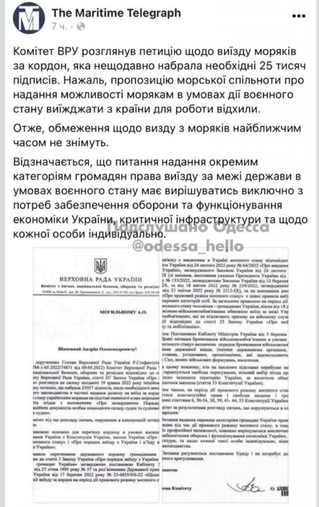 Это на другую петицию комментарий "гаранта", не на моряцкую. Но тоже про возможность выезда мужчинам за границу для работы.