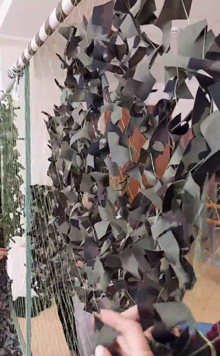 Мы плели сети, но это надо показывать, мы уже используем рыбацкие , где размер квадрата примерно 5х5 см. Спортивные сетки с крупными дырками, поэтому мы сначала их уменьшали ленточками, потом камуфлировали.