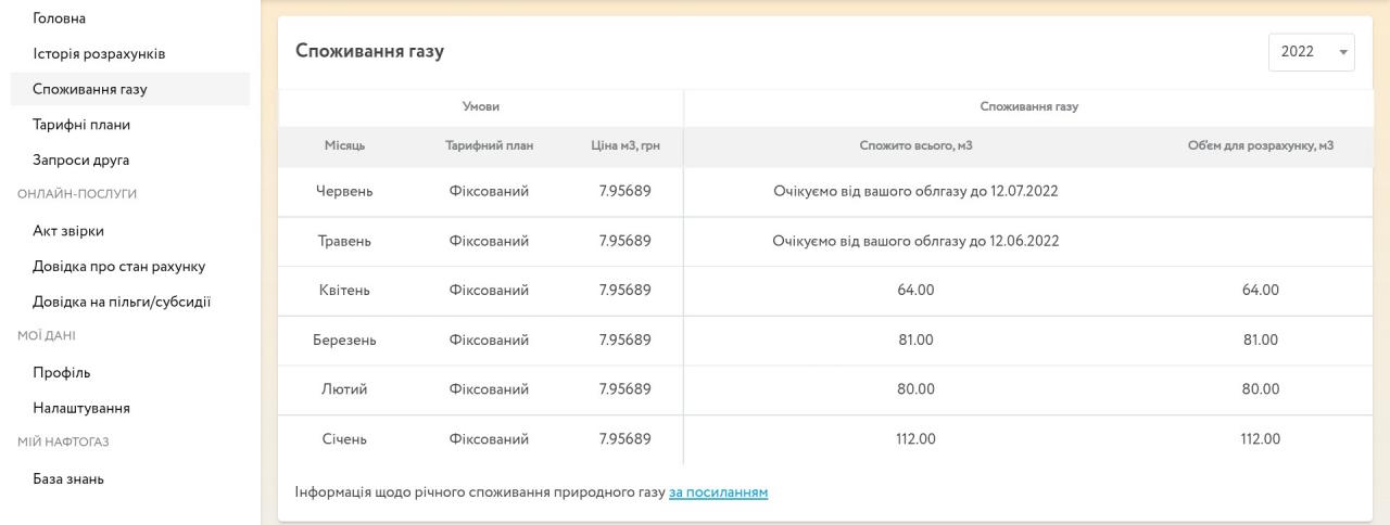 Посмотрите в разделе "Розподіл газу" в графе "сплачено" напротив того месяца когда последний раз платили абонплату за трубу.