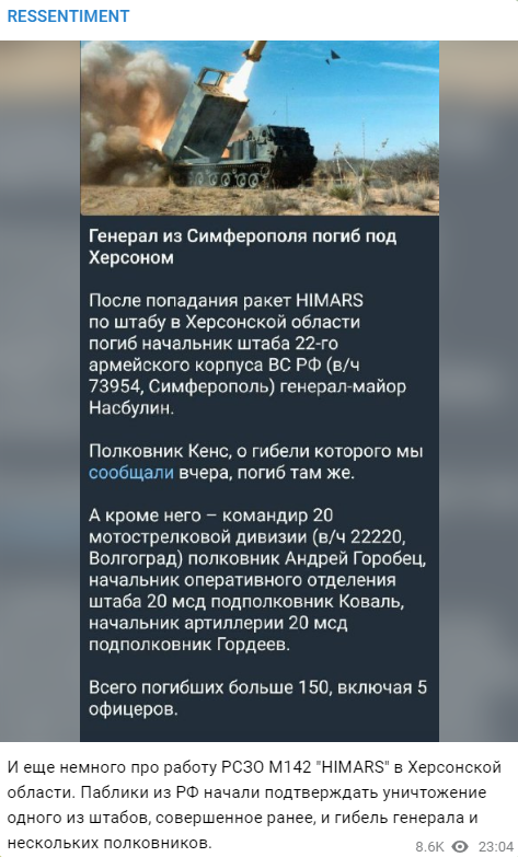 Підтверджено щонайменше 200 снарядів для РСЗВ "Смерч" та великий склад з іншим озброєнням. Також недалеко від епіцентру вибуху знаходився автопарк орків, де стояло понад 50 бензовозів.