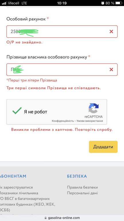 Я оплачиваю коммуналку соседке и хотела добавить её себе в газолину, чтобы вносить показания, но форма на обоих сайтах выдает, что Особовый рахунок не знайдено и Три перших символи Призвища не спивпадають (.