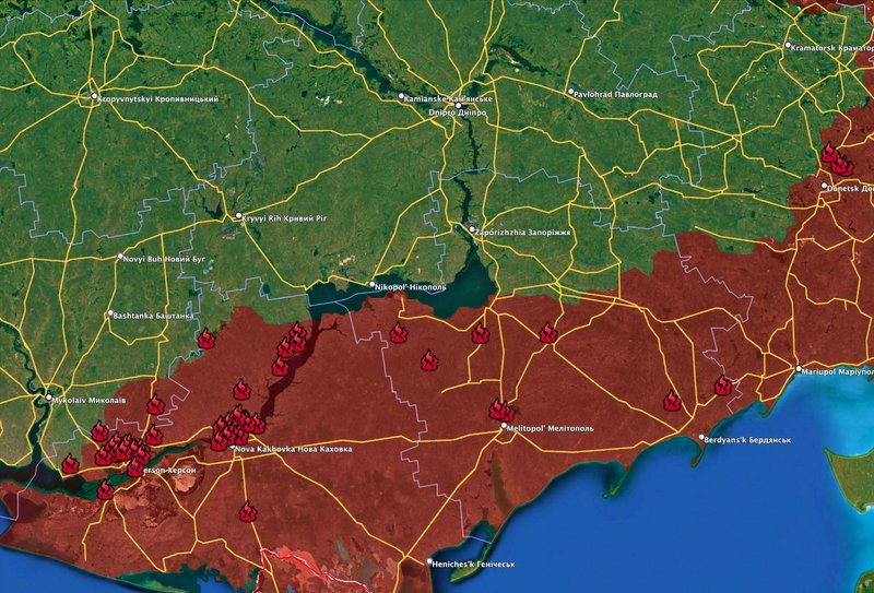 Большинство ударов было нанесено по Херсонской области, включая Херсон (x9), Новую Каховку (x5), Мелитополь (x2), Бердянск (x2), Чернобаевку (x2), Токмак, Широкая Балка, Берислав, Мосты (x3) и еще 23 локации
