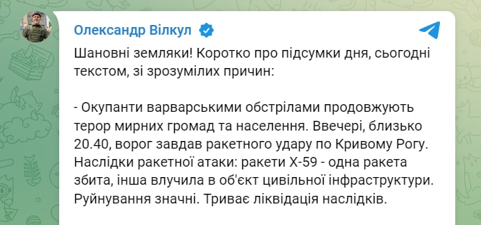 ⚡️Під час ракетного удару російських винищувачів Су-35 застосовано п’ять керованих авіаційних ракет класу "повітря-поверхня" типу Х-59 по об'єктах Дніпропетровської і Запорізької областей.