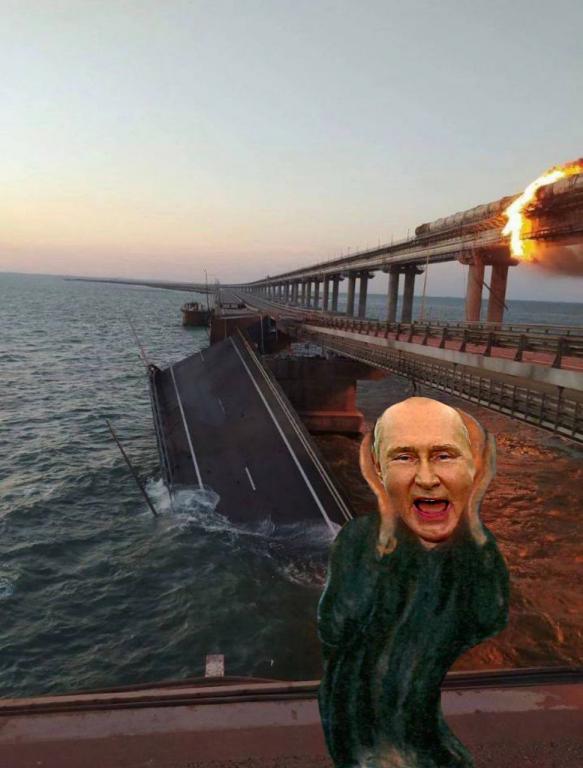 А знаєте, Москві підрив мосту теж вигідний. Це ж усе те лайно, що вони до нас приперли через Крим, уся та вєліка армія, а також усі ті перевертні у Криму - залишаться смердіти у нас, живі чи мертві. Це ж не треба їх назад повертати, щось виплачувати і лади роздавати. Дуже зручно так. Це ще нам буде до хріна мороки, щоб їх якимось чином хоча б до кордону десь під Ростовом доставити і копняками додому на болота вигнати!
