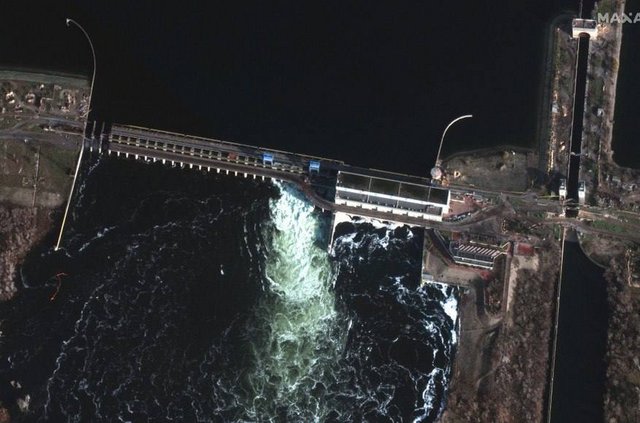 Видання NPR опублікувало супутникові знімки дамби ГЕС, на якій видно, як швидко витікає вода. Це загрожує катастрофою на Запорізькій атомній електростанції. Якщо рівень води продовжить падати, то ядерні реактори не зможуть отримувати воду для охолодження.