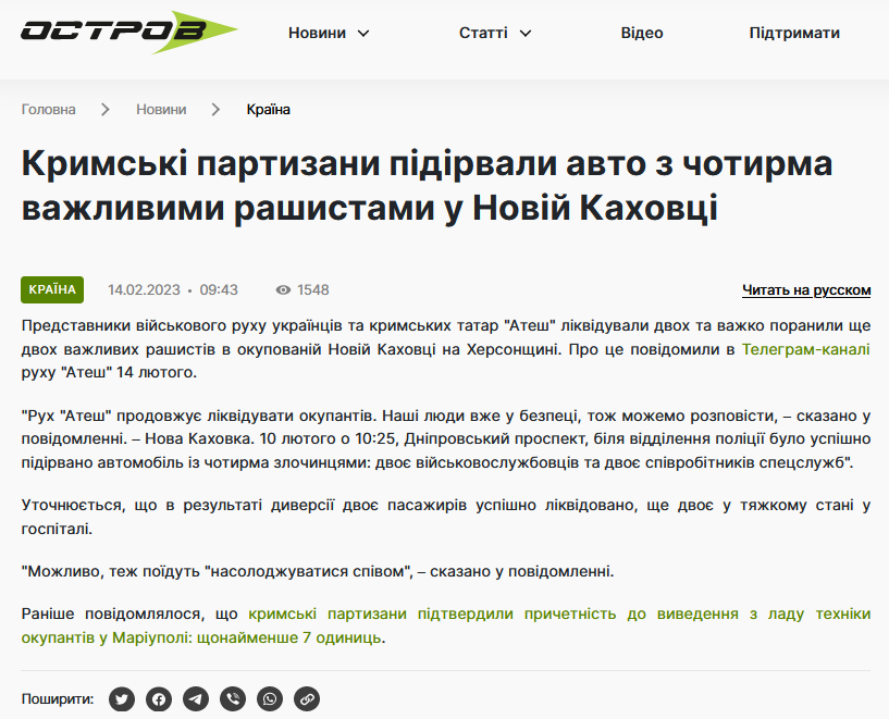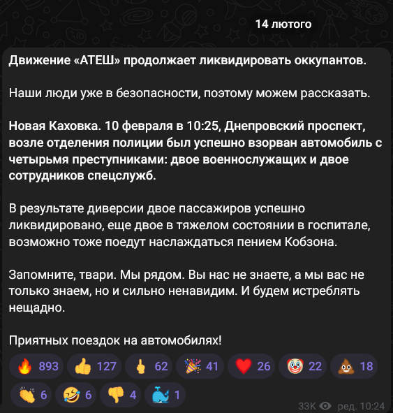 я допускаю, что в Крыму могут быть партизаны. но скажи мне, если сделали десятки схронов в Джанкое, зачем это афишировать, чтобы ФСБ пошло чистить Джанкой? А "Мы сейчас будем минировать железку позади нас". если ее на самом деле минируют на этом участке, ты думаешь так сложно выяснить где именно? Если они просто хотели объявить о себе, чтобы население, которое ждет ВСУ имело надежду, то сообщать о схронах и минировании не имеет смысла.