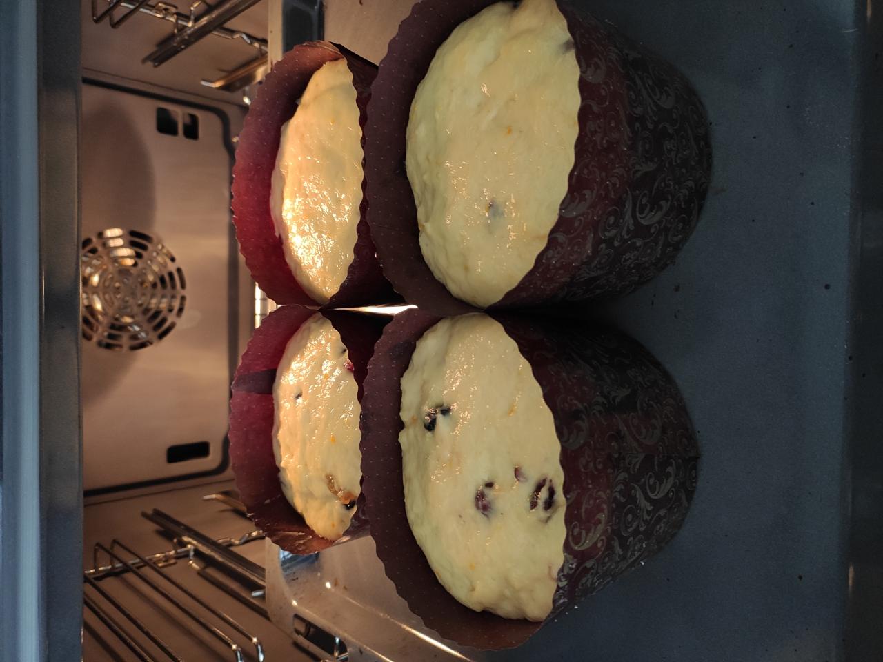 Девочки, сегодня утром я спрашивала про консистенцию теста из холодильника, спасибо всем кто ответил и помог советом. Теперь могу уже и показать результат, может быть кому-то поможет кто только собирается такие печь. Это порция на 600 грамм муки, получилось 4 штуки, взвешивала в сыром виде - по 470-480 грамм каждая. На первом фото - тесто уже комнатной температуры только переложенное ложкой в формы, оно прям очень вязкое, разровнять до ровной верхушки сразу не получается. Второе фото - после двухчасовой расстойки в тепле, перед закладкой на выпечку. Третье фото - уже украшены и упакованы для друзей