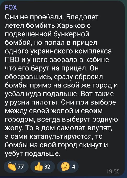 Теперь понятно, как говнолетчиков "инструктируют": если захватят наведением ПВО - опустошай бомболюк прямо там, где летишь и сваливай. Только вот теперь это произошло в глубине территории болот, пэтриот могёт))))))