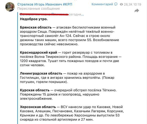 Цієї ночі невідомі добрі безпілотники також атакували військовий аеродром у Брянській області. Щонайменше 2 дрона влучили, окупанти повідомляють про пошкодження літака Ан-124.