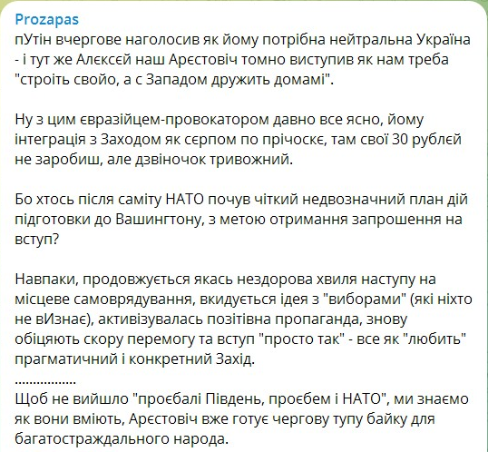 ...Щоб не вийшло "проєбалі Південь, проєбем і НАТО", ми знаємо як вони вміють, Арєстовіч вже готує чергову тупу байку для багатостраждального народа...