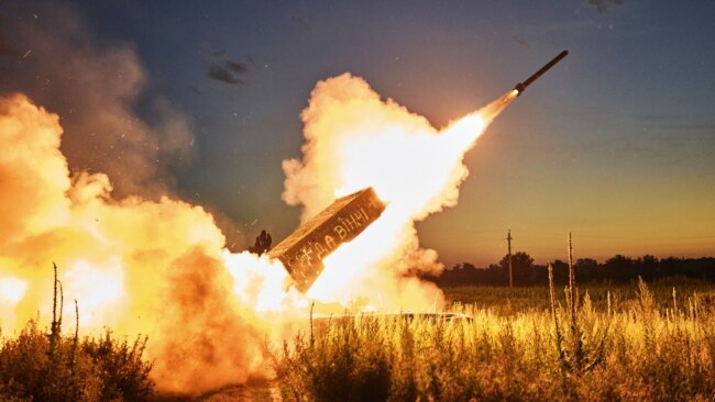 Бійці батальйону ЗСУ «Вовки Да Вінчі» ведуть вогонь по позиціях армії РФ із трофейної російської термобаричною ракетної установки ТОС-1А «Солнцепьок». Поблизу Кремінної на Луганщині, 7 липня 2023 року