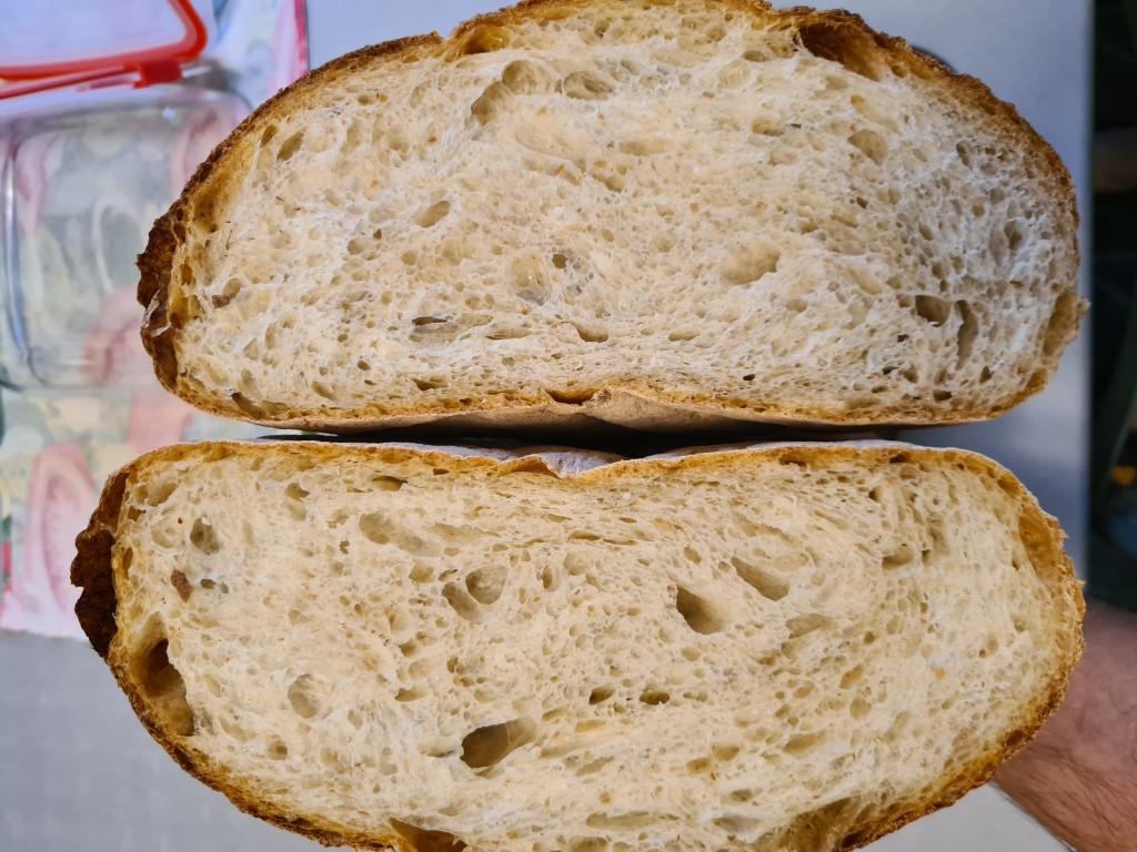 Мука наиболее напоминает мне тот самых "хлеб детства", который пытался повторить в формах-кирпичах. Даже характерный вкус у вчерашнего хлеба появляется и чуть сероватый оттенок. Возможно буду пробовать ))