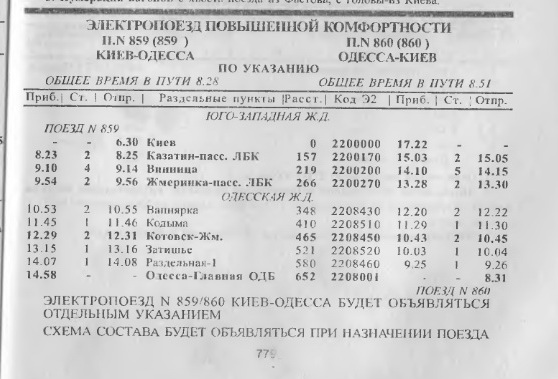 Сейчас нет электропоездов на Киев (никогда и не было, хотя была идея в далёком 2001, даже было проложено расписание скоростного электропоезда обычного типа, в пассажирской категории, т.н. "повышенная комфортность", разумеется, но что-то не сложилось в дальнейшем планировании и электропоезда 860/859 Одесса -- Киев мы так и не увидели).