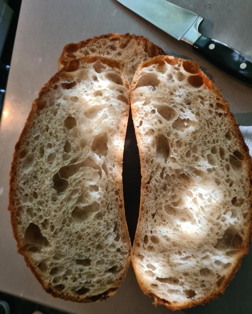 На фото - проба сделать чиабатту. Делал не на бигге, а с пулишем (20% от муки), по той же технологии, что и все хлеба. Брожение в холодильнике. Получилось очень близко. Мягкий, воздушный и очень нежный мякиш, тонкая корка. 19 минут на 250С с паром. Возможно можно было бы меньше, т.к. температура была 98С.