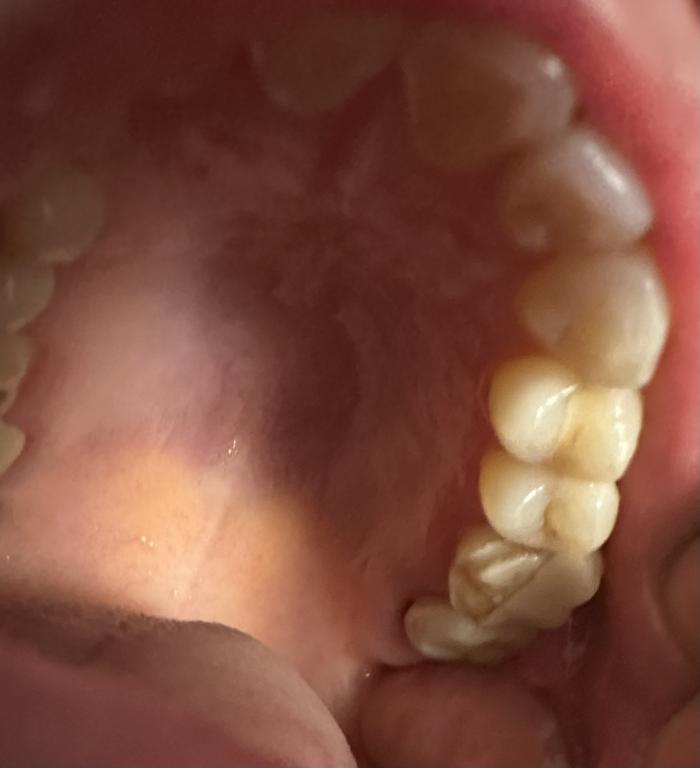 Восстановить спец композитом (ненадолго). Заменить коронку при возможности. Делать коронки на верхниее боковые зубы с металлической жевательной поверхностью (ее не будет видно). Облицовку располагать только на щечной поверхности. На фото не видно, облицовка скололась с металла или кусок коронки. Если облицовка, можно особо не спешить.