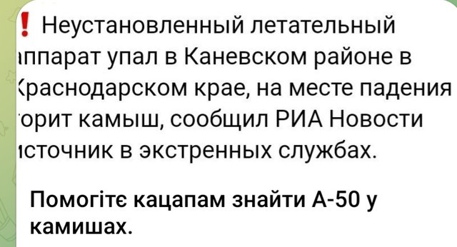 Стирила на кацапському ресурсі, але не могла не поділитись : " Российские власти никак не комментировали ситуацию. Но государственное издание РИА Новости сообщило, что “неустановленный летательный аппарат упал в Каневском районе в Краснодарском крае, на месте падения горит камыш