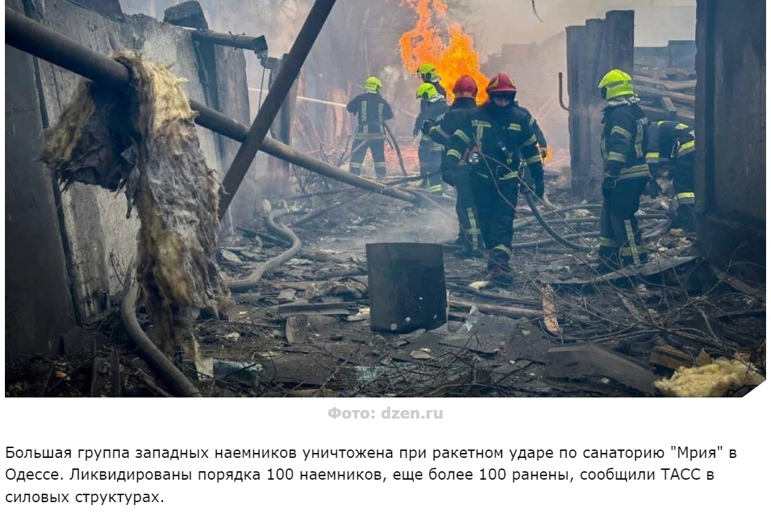 "Большая группа западных наемников уничтожена при ракетном ударе по санаторию "Мрия" в Одессе. Ликвидированы порядка 100 наемников, еще более 100 ранены"