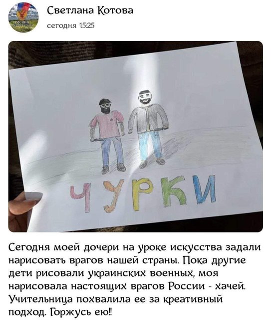 Я на работе, мне моя прислала фотку рисунков с апликацией нашей младшей дочери сегодня, младшая нарисовала и вырезала... ракеты как сумела, каких-то условных людей, отрезок бумаги с надписью "раша" и отрезок бумаги с сочетанием цветов украинского флага и на этом же отрезке улыбки и объяснила, что "это Украина в ответ стреляет по раше и мы все смеёмся"...
