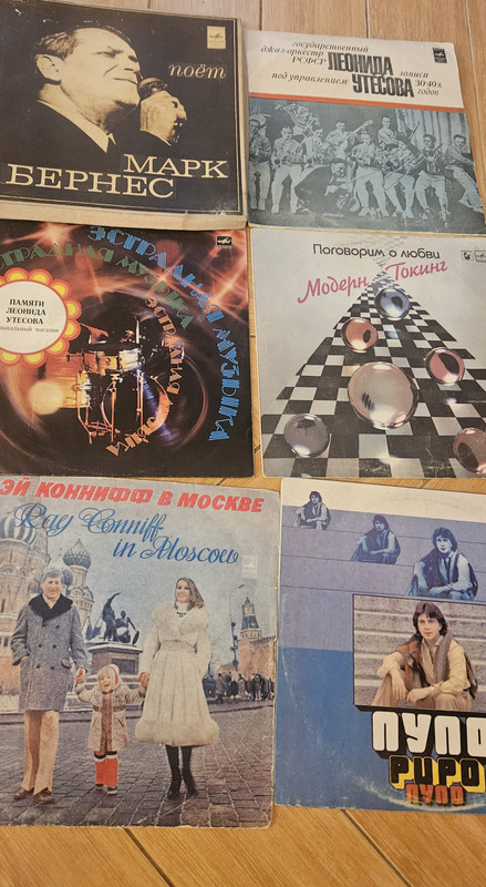 На Староконке продают дёшево (от 20 до 200 грн.) не только старые советские пластинки, но и б/у современные. Два нижних фото, как раз не новые пластинки, купленные на нашей Барахолке. Верхнее фото, новые, они дороже, особенно те что, по две пластинки в наборе.