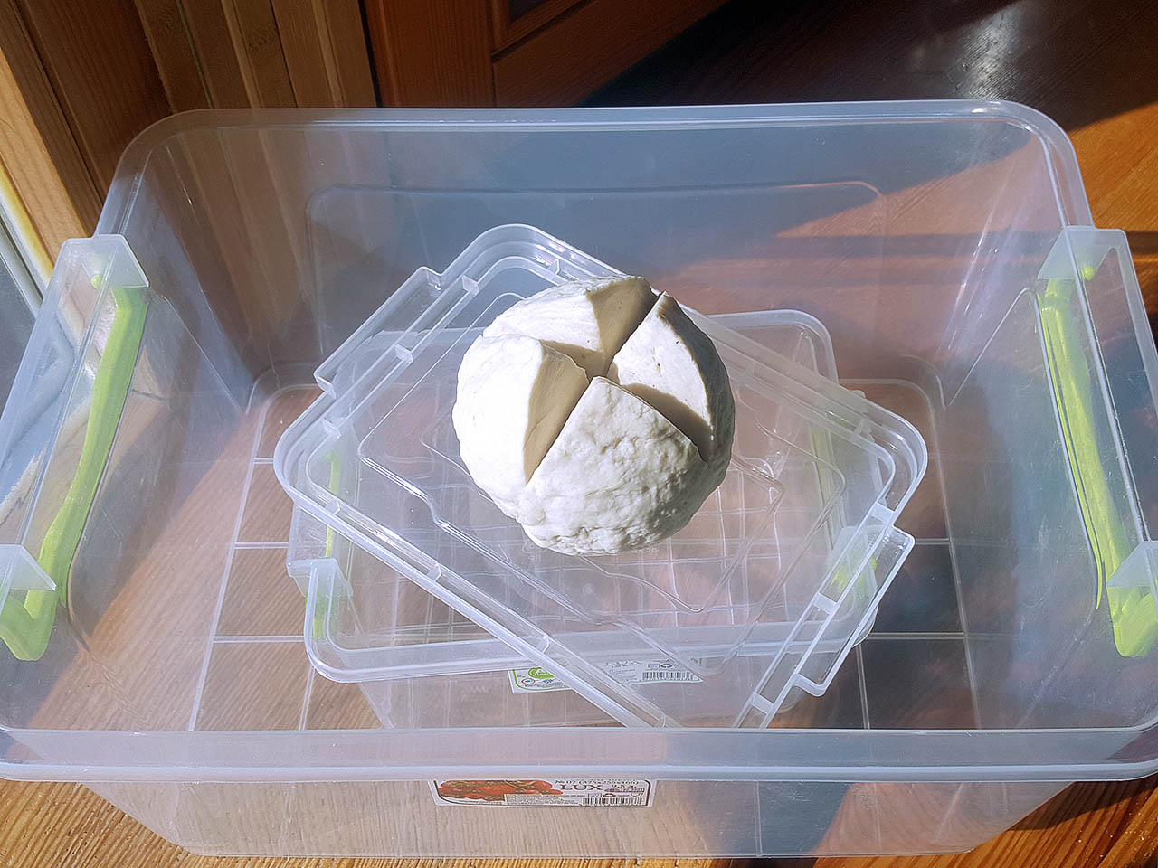 Убрал одну ламинацию, после замеса тесто оставил в ведре на 30мин,
