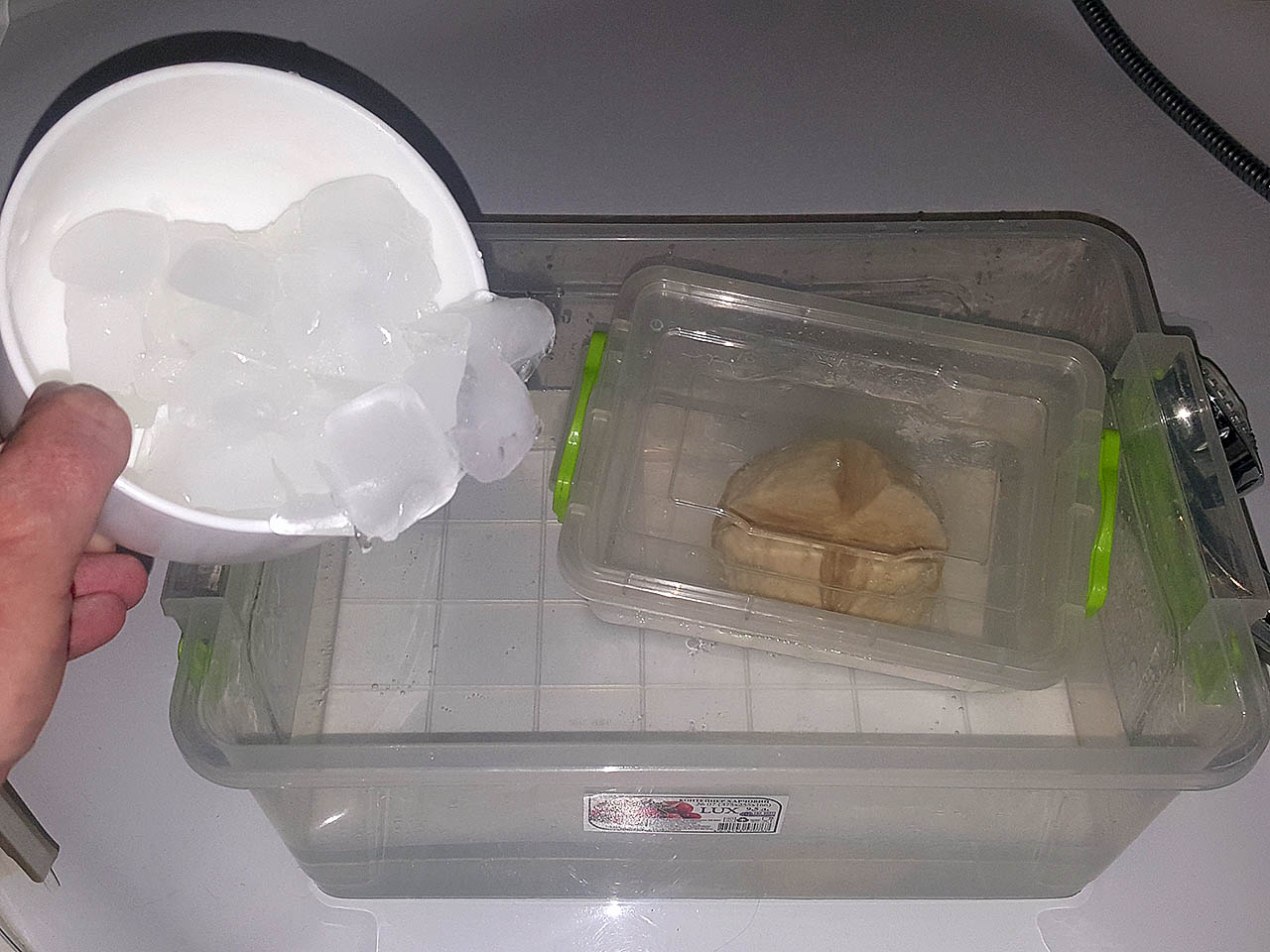 туда воду и лед, периодически подсыпал (не часто, раза три).