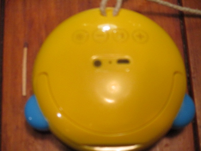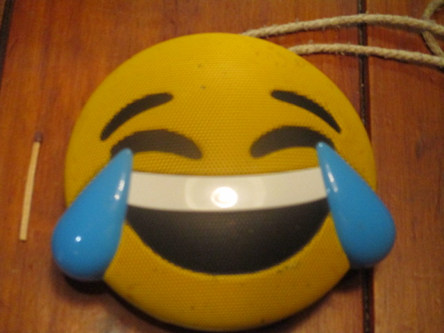 Анфас )). НЕ обращай внимания на царапины, или так краска чуток облезла - он у меня падал раз 100 ))), но продолжает работать как часы. Эти спикеры продавались в виде самых разных смайликов\эмодзи. Я оч вечёлый чел, поэтому и выбрала самый весёлый смайлик. Если слушать на полную громкость, то хватает минимум на 3 часа. Но я на полную никогда не включаю, реально громко, мне такой шум не нужен ))). Так что при средней громкости минимум 4 часа бесперебойной работы.