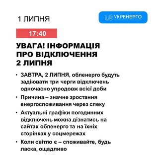 «Укренерго» повідомляє, що будуть відключати три черги одночасно. Причина - зростання електроспоживання через спеку.