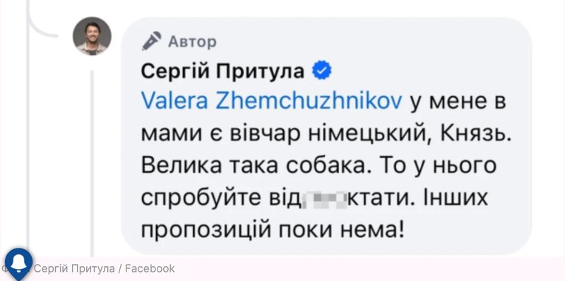 "У меня у мамы есть овчарка немецкая, Князь. Большая такая собака. Так у него попробуйте отсосать. Других предложений пока нет" – ответил Притула