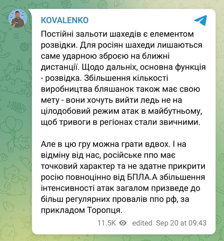 Росіяни планують перейти на цілодобовий режим атак, щоб зробити тривоги в Україні звичними, — Коваленко