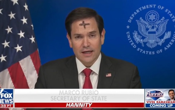 Интересно, что во время прямого эфира на его лбу была черная крестообразная метка. Сначала все подумали, что это сгенерированный ИИ рисунок, но нет, он оказался подлинным. Дело в том, что госсекретарь США – католик, а метка – это часть христианской традиции.