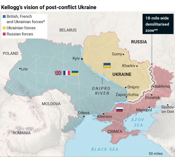Зокрема, Келлог пропонує розмістити британсько-французький контингент разом з українськими військами на правобережжі Дніпра та заході України.