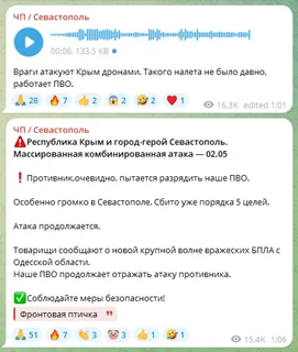 Близько 01:00 години місцеві пабліки повідомили про "масовану комбіновану атаку" по Криму. За даними росіян, у небі над Севастополем було збито щонайменше 5 ударних БпЛА.