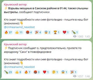 Близько 01:40 години також було гучно у Сакському районі. Там пролунала серія вибухів, було чутно роботу протиповітряної оборони. Місцевий паблік "Крымский ветер" інформував, що вибухи було чутно у районі аеродрому "Саки", а підписники каналу повідомили про ймовірний "приліт" по летовищу.