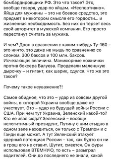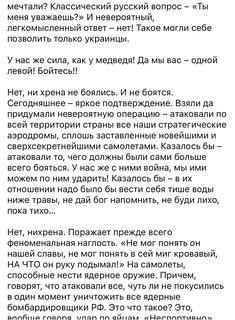 Ну я впевнена, що шахедами по мирним не обійдеться, не треба недооцінювати цю кгбшну мерзоту, просто вирішують куди і як вдарити болюче, звісно не шахедами. Але вважаю, що треба продовжувати такі справді блискучі і відчайдушні операції, вони мають великий сенс і моральний, і бойовий, вони не можуть швидко відновити ці літаки, навіть тільки ушкоджені, тож трохи меньше буде вилітати їх, щоб бомбити нас.війна зараз на самій жорстокій стадії, коли вони відкинули усі маски: не б'ємо по цивільних, не б'емо по лікарнях. Зрозуміло, що б'ють, куди достануть, чим можуть, по всьому, без винятку. Але ми ж про це і так знали, на відміну від Трампа, хоч , мабуть, і він вже здогадався.