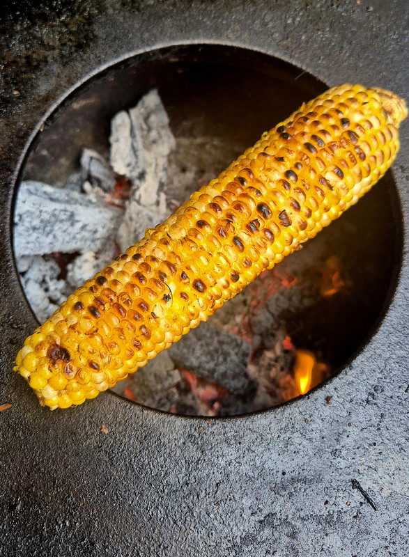 Шашлык из кукурузы. В смысле не на тонкой палочке из металла, а на углах, пардон, углях. Сейчас вывели специальные кормовые сорта кукурузы, варится считанные минуты, когда обычная кукуруза очень долго и всё равно деревянная, а специальная кормовая для человека -- несколько минут -- и мягкая и вкусная.
