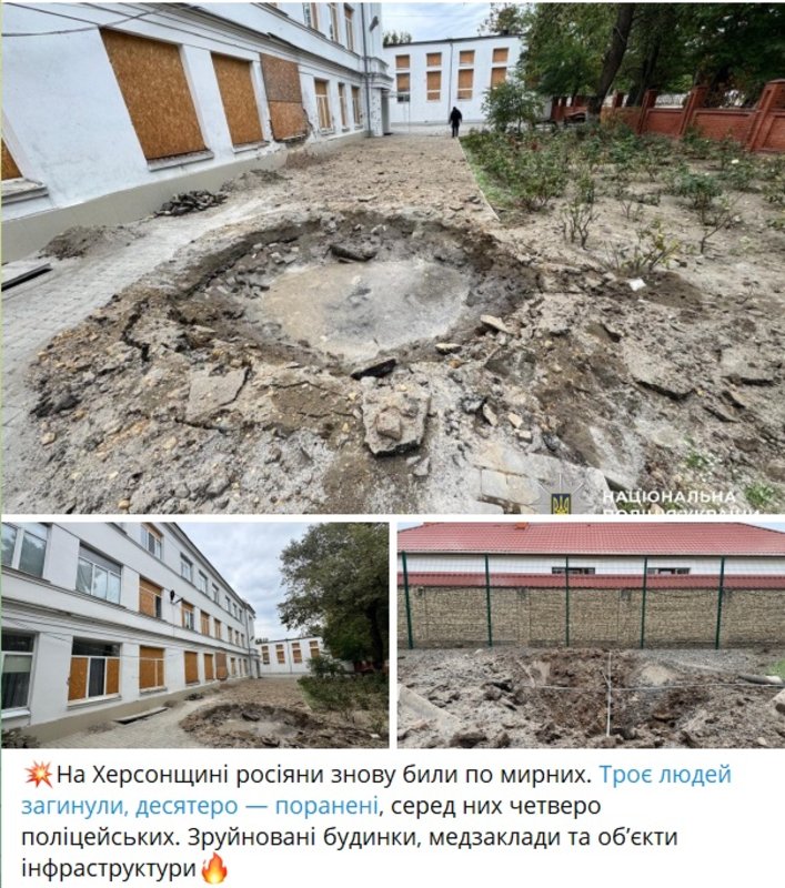 Російська армія продовжує обстрілювати деокуповані території Херсонської області, минулої доби під удар потрапили Херсонський та Бериславський райони — ворог бив з артилерії, танків, мінометів, РСЗВ, авіації та дронів-камікадзе. Про це повідомили у прес-службі ГУ НП України у Херсонській області. Від атак постраждали десятки населених пунктів, зокрема Херсон, Садове, Антонівка, Кізомис, Придніпровське, Софіївка, Станіслав, Білозерка, Наддніпрянське, Розлив, Велетенське, Інженерне, Зеленівка, Янтарне, Берислав, Високе, Архангельське, Хрещенівка, Михайлівка, Козацьке, Веселе. Російські удари пошкодили п’ять приватних будинків, медичний заклад, адміністративну будівлю, об’єкт критичної інфраструктури, спортивний клуб, СТО, склад і чотири автомобілі. Унаслідок атак загинули троє мирних жителів, ще десятеро людей поранені, серед них — четверо поліцейських.
